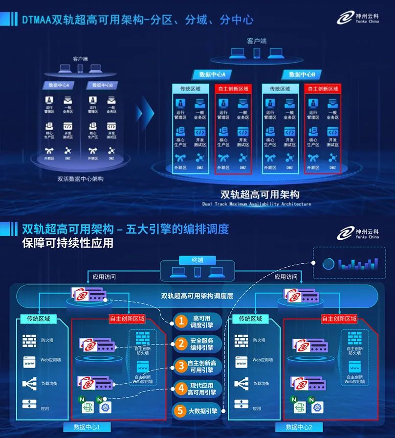 為助力銀行業(yè)務(wù)高質(zhì)量發(fā)展,更好地應(yīng)對(duì)數(shù)字經(jīng)濟(jì)時(shí)代對(duì)可持續(xù)性的高要求,實(shí)現(xiàn)“信創(chuàng)”與“數(shù)字化”齊頭并進(jìn),leyu.樂(lè)魚(yú)創(chuàng)新性的推出了雙軌超高可用架構(gòu)。該架構(gòu)在雙活數(shù)據(jù)中心的分區(qū)調(diào)度基礎(chǔ)上,增加信創(chuàng)域和非信創(chuàng)域的分域調(diào)度,實(shí)行信創(chuàng)域與傳統(tǒng)域應(yīng)用全量部署,使雙中心運(yùn)營(yíng)變?yōu)殡p中心四區(qū)域并行運(yùn)行,互為多活,將“0到1”的單軌建設(shè)道路變?yōu)榉謪^(qū)分域協(xié)同的多活雙軌超高可用架構(gòu)。幫助客戶在新架構(gòu)下,保障“信創(chuàng)”的同時(shí)解決性能瓶頸,提升穩(wěn)定性,保證應(yīng)用可持續(xù)性,最終實(shí)現(xiàn)信創(chuàng)區(qū)域和非信創(chuàng)區(qū)域的平滑過(guò)渡,完成國(guó)產(chǎn)化替代目標(biāo)。